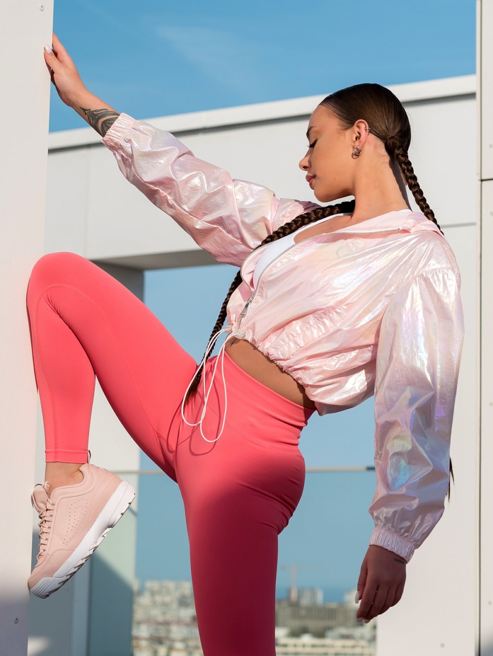 Dámská růžová sportovní bunda s kapucí, limitovaná edice značky s efektním designem ve světle růžové barvě. Model je typu větrovky, vhodný na běhání nebo procházku, na větrné jarní a letní dny. Bunda s kapucí je vybavena stahováním v pase a pogumovaným logem Peach Pump. Světlo se krásně láme tkaní a vytváří dojem kosmického designu. V tomto krásném modelu budete nepřehlédnutelnou a jedinečnou, skvěle se kombinuje se sportovním jednobarevným oblečením značky.