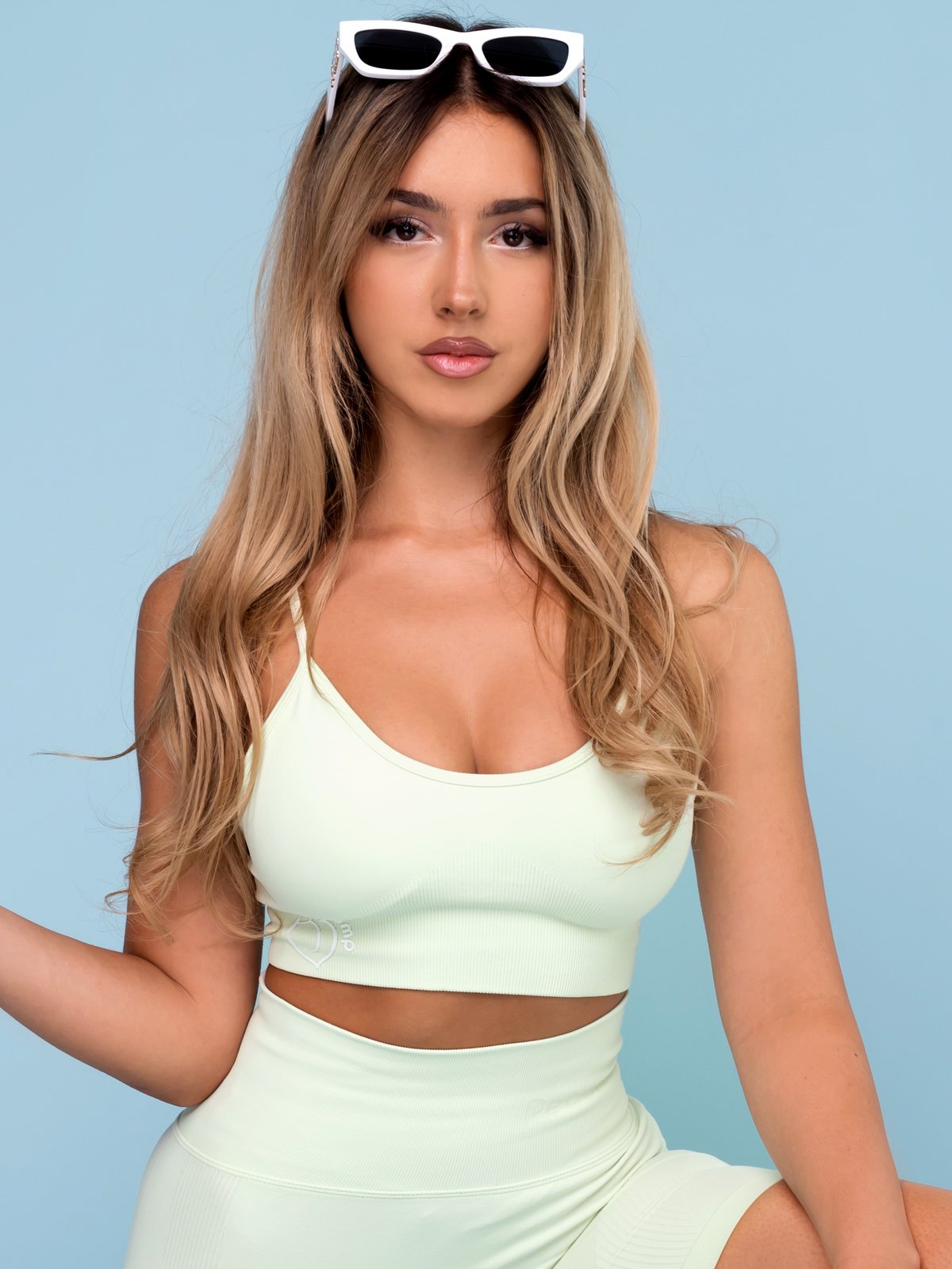 Bezešvá světle zelená sportovní podprsenka s odnímatelnými vycpávkami a nastavitelnými ramínky. Model je vyroben z měkké, velmi pružné a prodyšné tkaniny, která odvádí vlhkost od těla. Podprsenku lze nosit i pod oblečením, její design je nenápadný a v ní budete mít pocit pohodlí a volnosti pohybu. Je k dispozici v různých barvách, lze ji sladit s legínami stejné nebo jiné barvy. Viz sekci Sportovní sety.