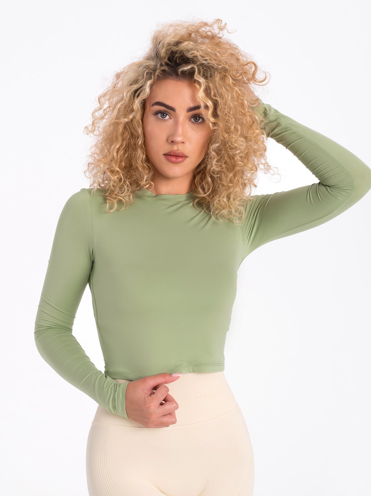 Green classic crop top t-shirt with long sleeves, made of extremely soft to the touch fabric. It fits perfectly on the body, and its cut makes it an important piece in both your sports and casual attire. Suitable for gym training, running, aerobic exercise or an everyday walk in the park, it does not retain moisture in the body. The t-shirt has a heat-sealed “Peach Pump” logo on the shoulder, which is small and stands gently. You will love the softness of this model and the way it sits on your body. Pairs perfectly with many of our leggings.