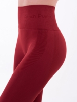 Varrás nélküli női leggings bordó színben, rugalmas és puha tapintású anyagból készült. Ez a modell tökéletesen alakformáló, a Peach Pump lógóval rendelkező széles bordás kötésű derékszíja pedig finoman körbeöleli a derekat. A leggings anyaga elrejti a problémás részeket, elvezeti a nedvességet a testtől, és olyan elemekkel rendelkezik, amelyek a tökéletes kerek popsit formálják a gyönyörű és kecses sziluett érdekében. Ezzel a modellel kényelmesen és magabiztosan fogja érezni magát. Ez a modell párosítható ugyanilyen mintájú sportmelltartóval, vagy saját, egyedi és eltérő sportöltözetet készíthet kabátok, sportmelltartók és kiegészítők széles választékának segítségével.