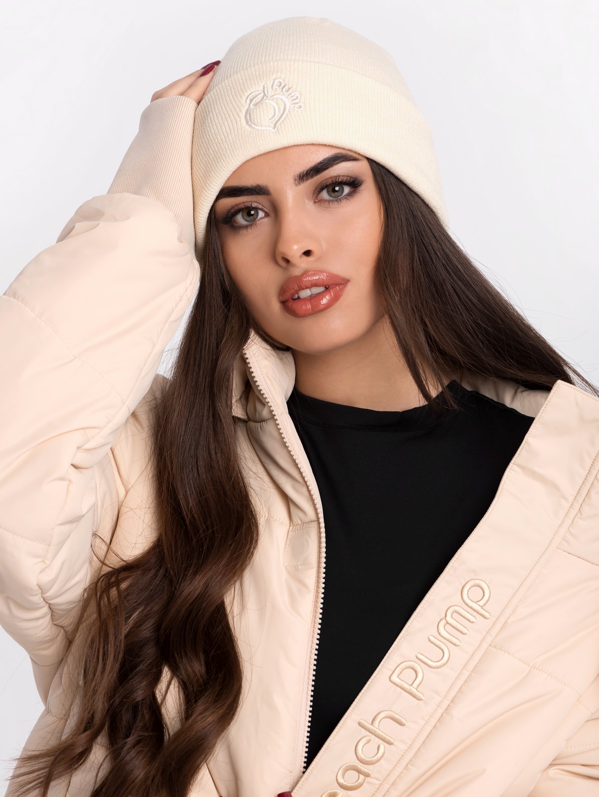 Beżowa czapka zimowa z kolekcji “Peach Pump” z haftowanym logo 3D z przodu. Czapka ma elastyczną konstrukcję z niezwykle miękkiego i przyjemnego w dotyku materiału. Wywinięcie u dołu dodatkowo chroni przed wychłodzeniem. Czapka jest dostępna w różnych aktualnych kolorach sezonu A. Model ten będzie idealnym wykończeniem stroju w chłodne dni.