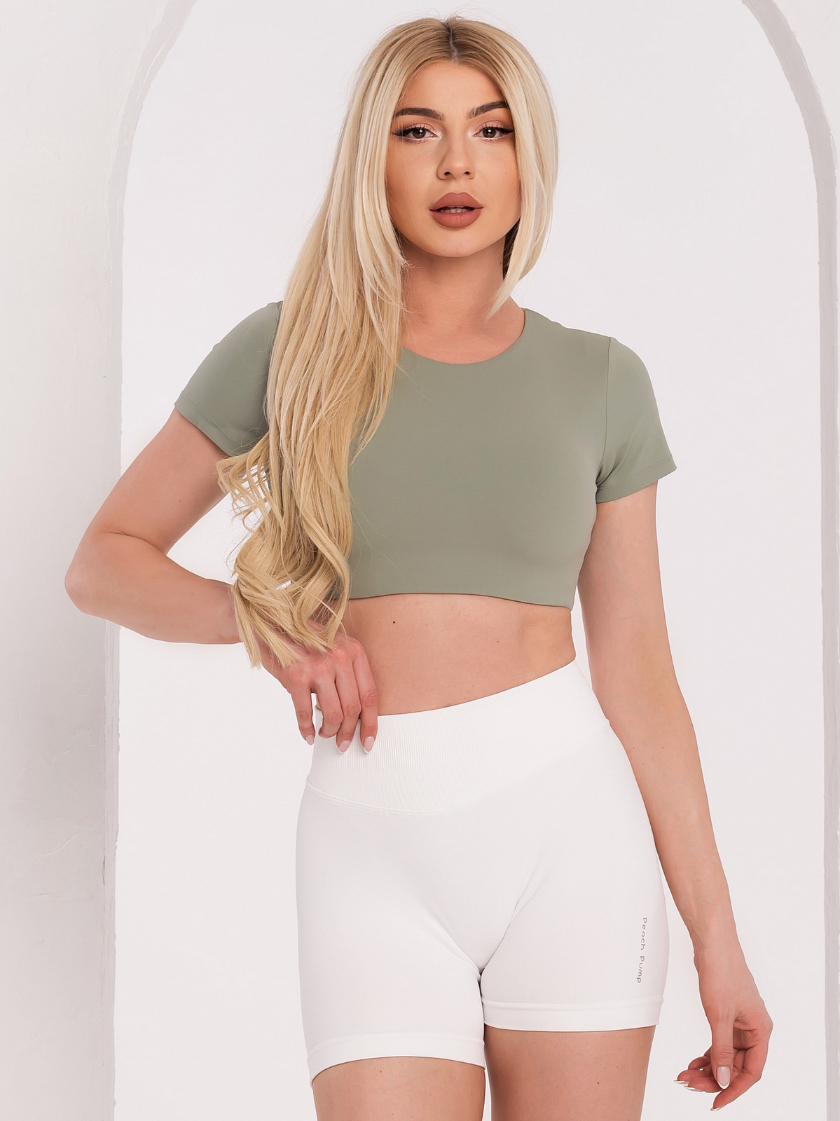 Krótka sportowa bluzka w kolorze zielonej „matchy”, obcisła, z poduszkami. Świetnie leży, a krój sprawia, że jest niezastąpionym elementem zarówno sportowego, jak i codziennego stroju. Nadaje się do fitnessu, biegania, ćwiczeń aerobowych lub spaceru po parku, ma ukrytą gumkę u dołu, poduszki, którą można zdjąć i materiał, który nie zatrzymuje wilgoci w ciele. Koszulka ma termicznie najklejone logo „Peach Pump” na ramieniu, które jest minimalistyczne i prezentuje się subtelnie. Zakochasz się w tym modelu i sposobie, w jaki układa się na ciele. Idealnie pasuje do wszystkich naszych krótkich i długich legginsów.