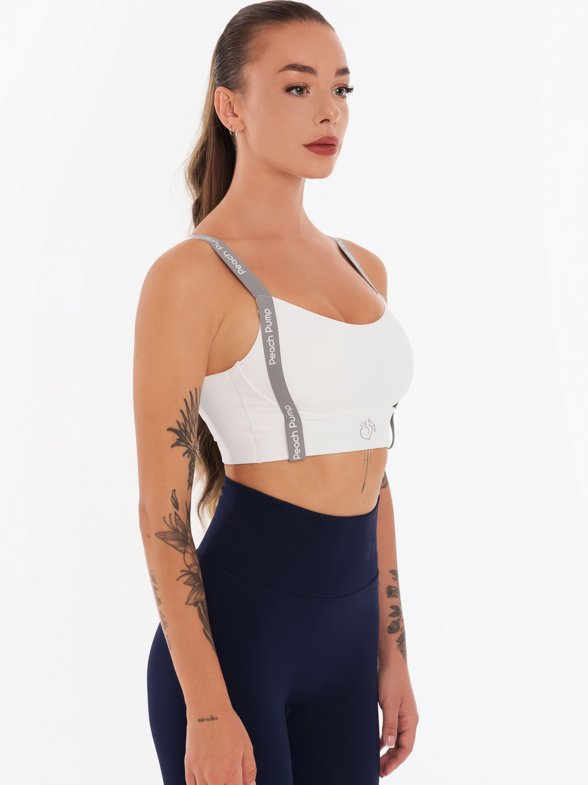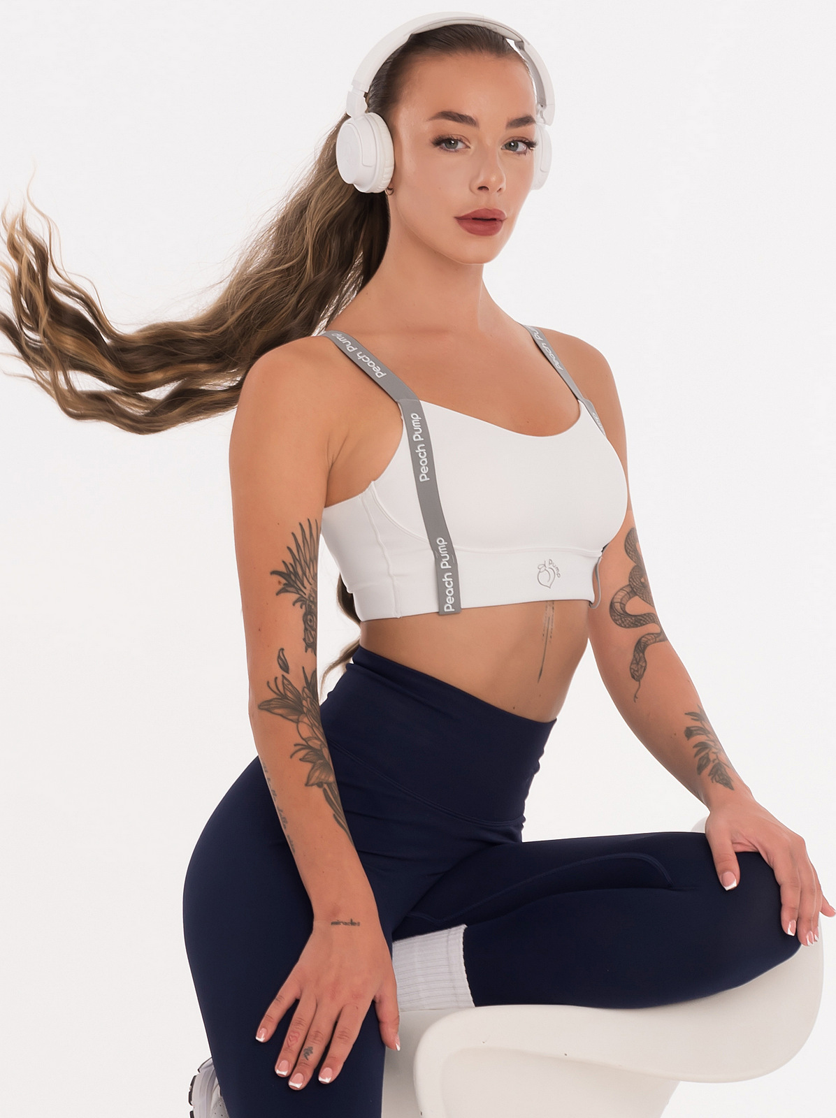 Бяло спортно бюстие с предни сиви презрамки и бели надписи Peach Pump. Моделът има подплънки с така любимият Ви super push-up ефект, създаден за жени, които искат да се чувстват уверено, секси и стилни във фитнеса или извън него. Еластичната и дишаща материя осигурява удобство, бързо извежда влагата от тялото и Ви поддържа свежи. Бюстието има интересен, еластичен гръб със закопчаване на няколко степени за по-добра поддръжка на бюста по верен в на тренировка. Подходящ е за фитнес, йога, кардио, аеробни тренировки или ежедневно носене. Предлага се в няколко актуални и лесно за комбинация разцветки. Този модел бюстие на Peach Pump е новият must-have , който трябва да добавите в гардероба си.