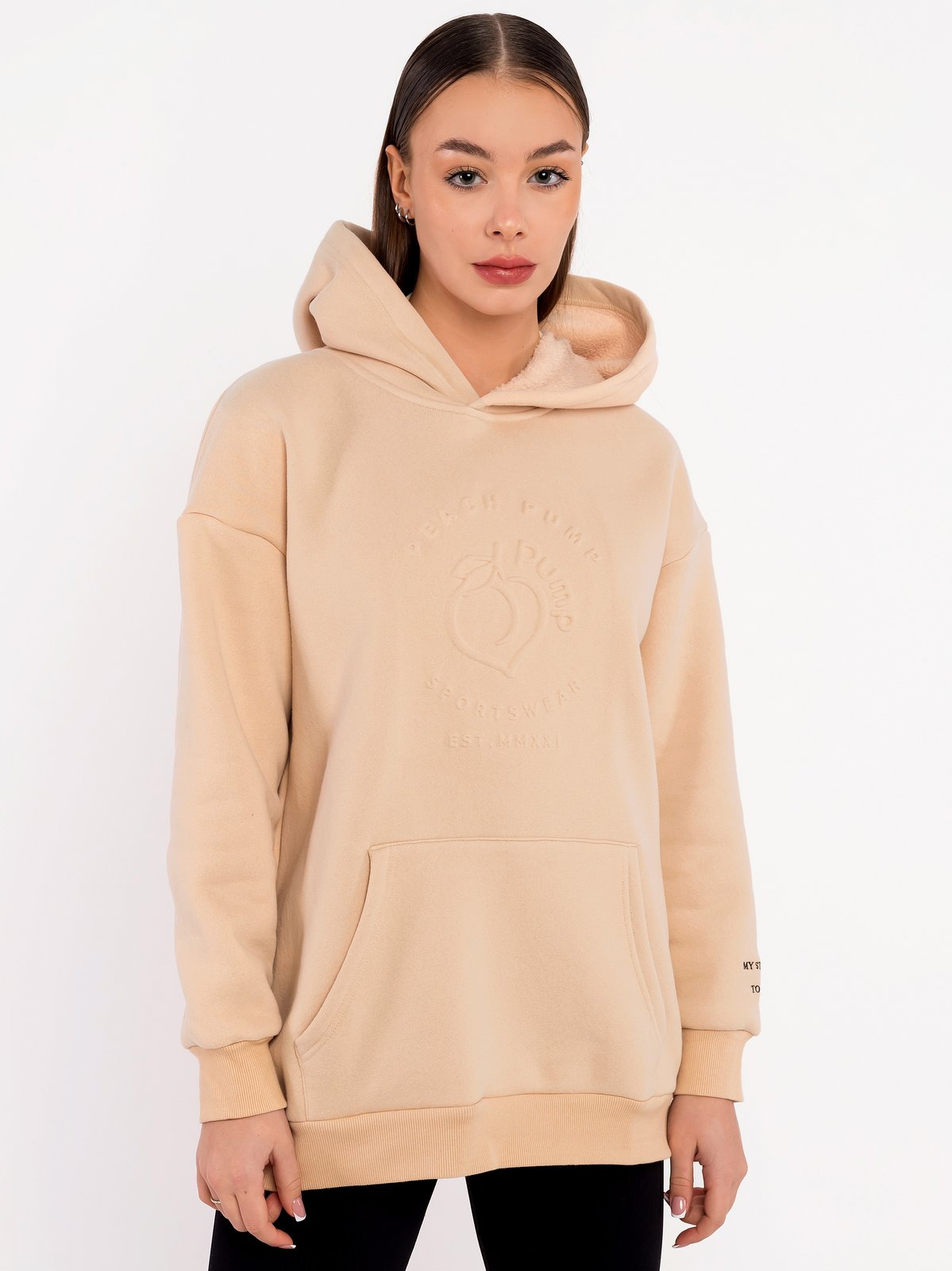 Спортен ватиран суитчър с качулка и преден джоб тип “Hoodie” в кремав цвят. Изработен от 80% памук с мека ватирана вътрешна подплата. Този модел худи е с предна 3D щампа “Peach Pump” подсилена във вътрешната част за по-голяма издръжливост, моля не махайте подсилващият плат и не гладете с ютия върху щампата. Спортният суитчър е с паднали ръкави и бродерия на единия ръкав. Модерна свободна кройка за по-голям комфорт и свобода на движене. Има голяма качулка с гумирано лого “Peach Pump” в задната част.