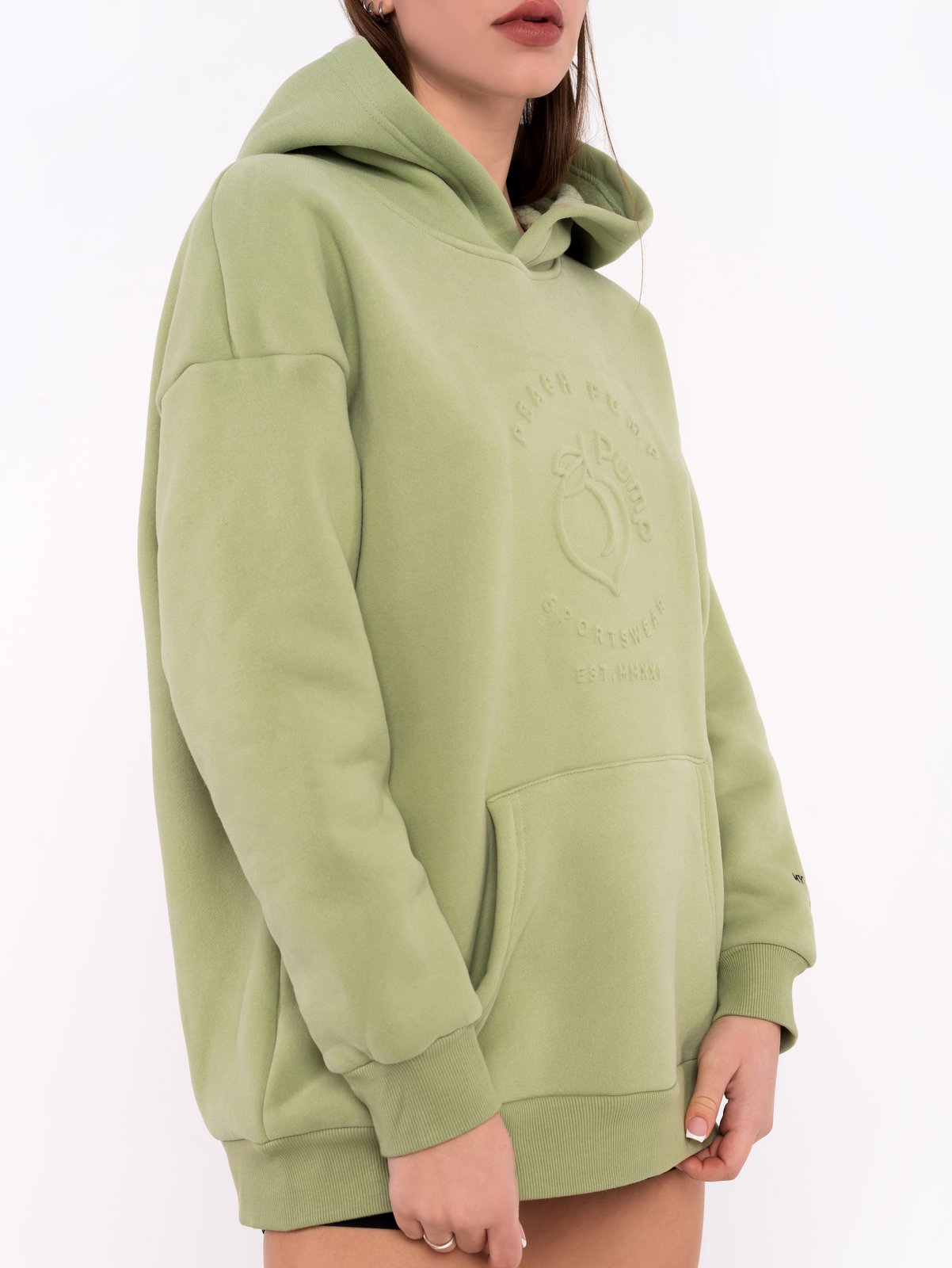 Спортен ватиран суитчър с качулка, “hoodie”, и преден джоб тип кенгуру в зелено. Изработен от 80% памук с мека ватирана вътрешна подплата. Този модел худи е с предна 3D щампа “Peach Pump” подсилена във вътрешната част за по-голяма издръжливост, моля не махайте подсилващият плат и не гладете с ютия върху щампата. Спортният суитчър е с паднали ръкави и бродерия на единия ръкав. Модерна свободна кройка за по-голям комфорт и свобода на движене. Има голяма качулка с гумирано лого “Peach Pump” в задната част.