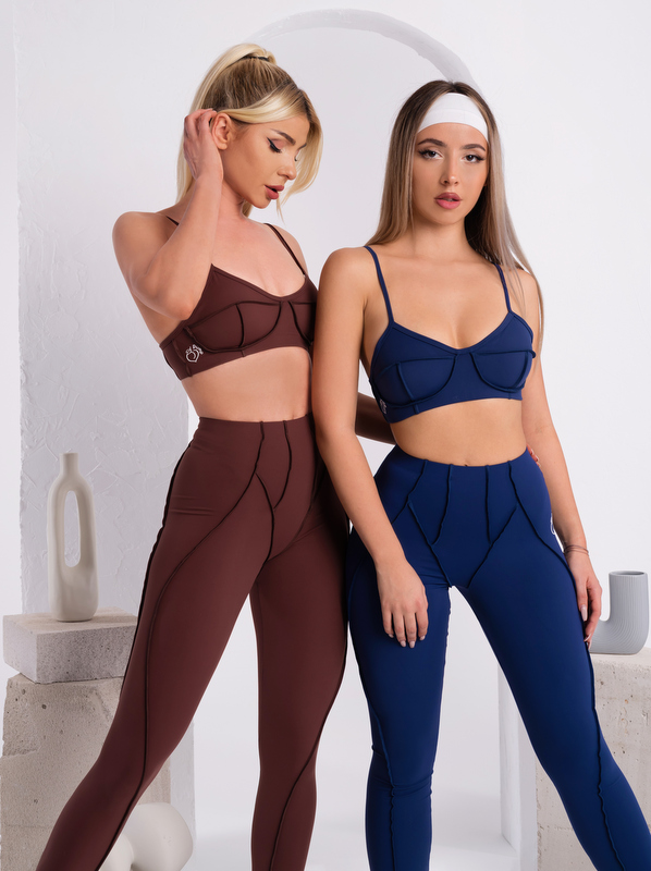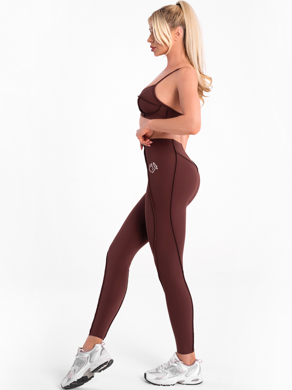 Дамски кафяв спортен комплект – клин и бюстие, с модерни 3D обърнати шевове. Материята на клина е мека и еластична , дава пълна свобода на движение и удобство по време на спорт. Дизайна на ластика на клина е скрит и по този начин издължава фигурата. Бюстието има подплънки с повдигащ ефект, които могат да се махат и тънки презрамки. Спортният екип се предлага в три модерни за сезона разцветки, бъдете стилна и различна.