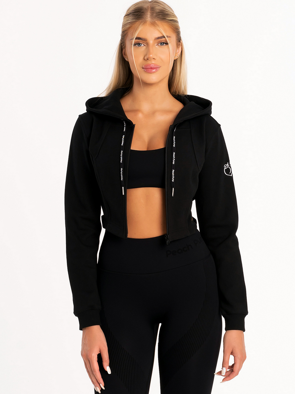 Къс черен суичър с цип и качулка. Този модел има скъсена кройка (cropped fit), подчертава линията на талията , има изрязаните детайли и придава изключително женствена и стилна визия. Суичърът има интересен детайл – мрежеста материя отстрани, която придава спортна визия и позволява на кожата да диша. Има преден цип с гравирано лого , широка качулка и с връзки с надписи “Peach Pump” по дължината и метални краища. Черният цвят е универсален и лесно се комбинира с тъмни или светли дрехи.