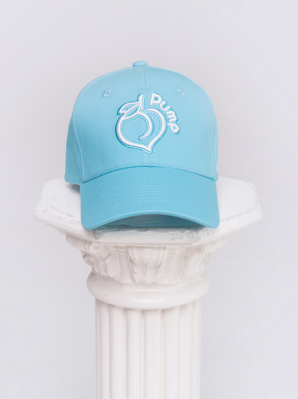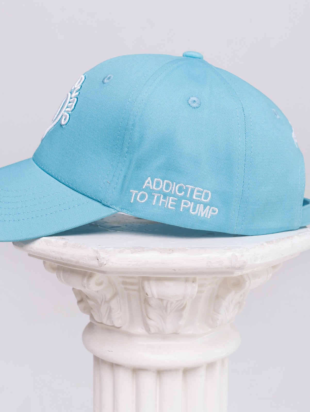 Съчетайте любимите си клинчета и бюстиета с небесно синя шапка с козирка Peach Pump. В горещите летни месеци тя ще е едно перфектно допълнение към визията Ви , като в същото време ще предпази лицето от яркото слънце. Шапката е с ефектен бродиран триизмерен дизайн с бяло лого със син кант и мотивационен надпис : “Addicted to the PUMP” . Шапката се регулира с метално закопчаване , а козирката е извита. Бъдете стилна и различна с този перфектен завършек на вашият спортен аутфит.