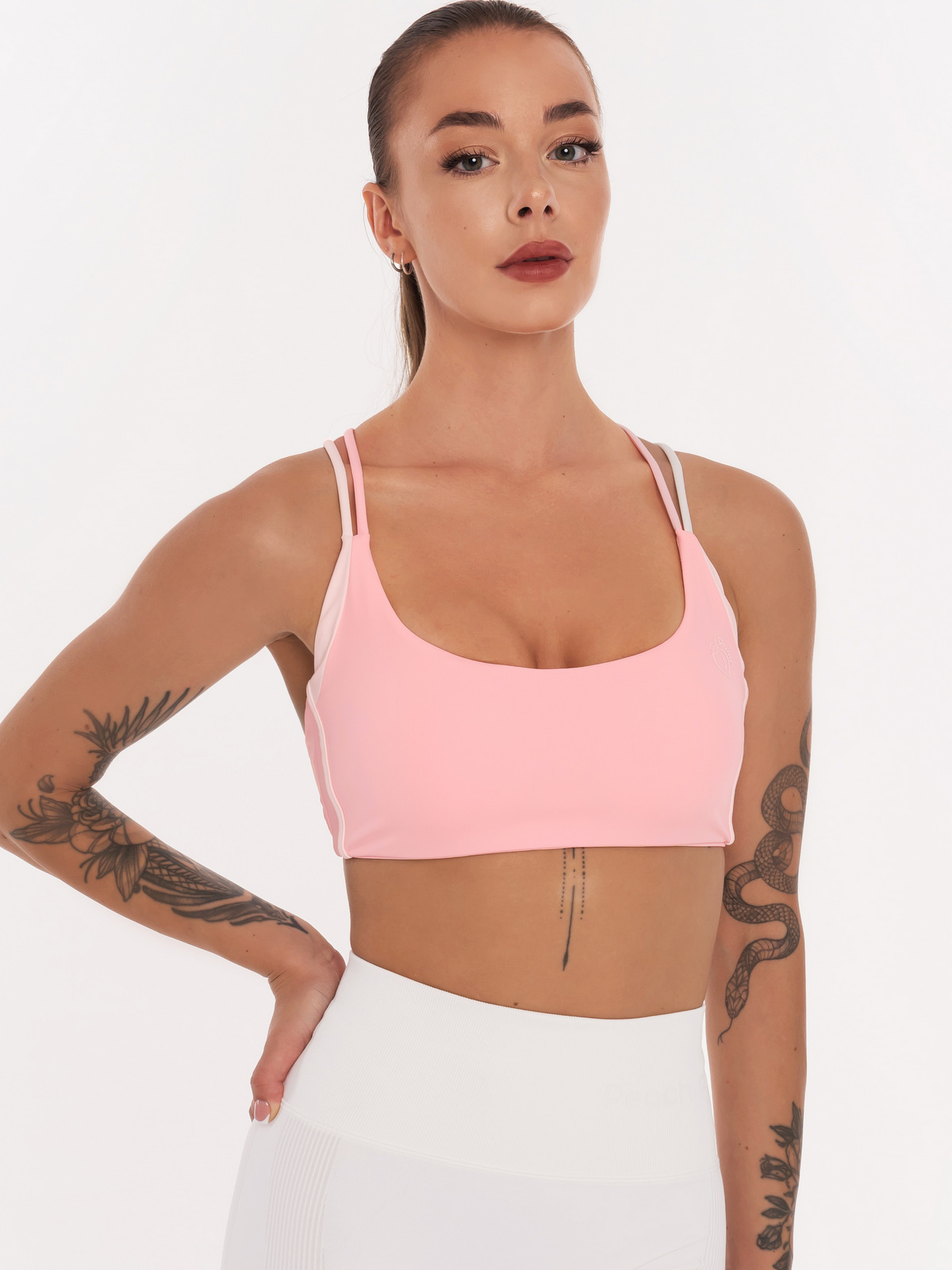 Розово бюстие с кръстосани презрамки в бяло и розово. Модела на бюстието е изрязан и има super push-up подплънки, които могат да се махат. Материята е изключително нежна и еластична, не задържа влагата в тялото, подходящо е за бягане, фитнес, йога, тенис или друг вид спорт. Дизайна на модела е много актуален за лятото предлага се в няколко разцветки и може да се съчетае в комплект с къса пола или клин. Има термично запечатено бяло лого в предната част на бюстието.