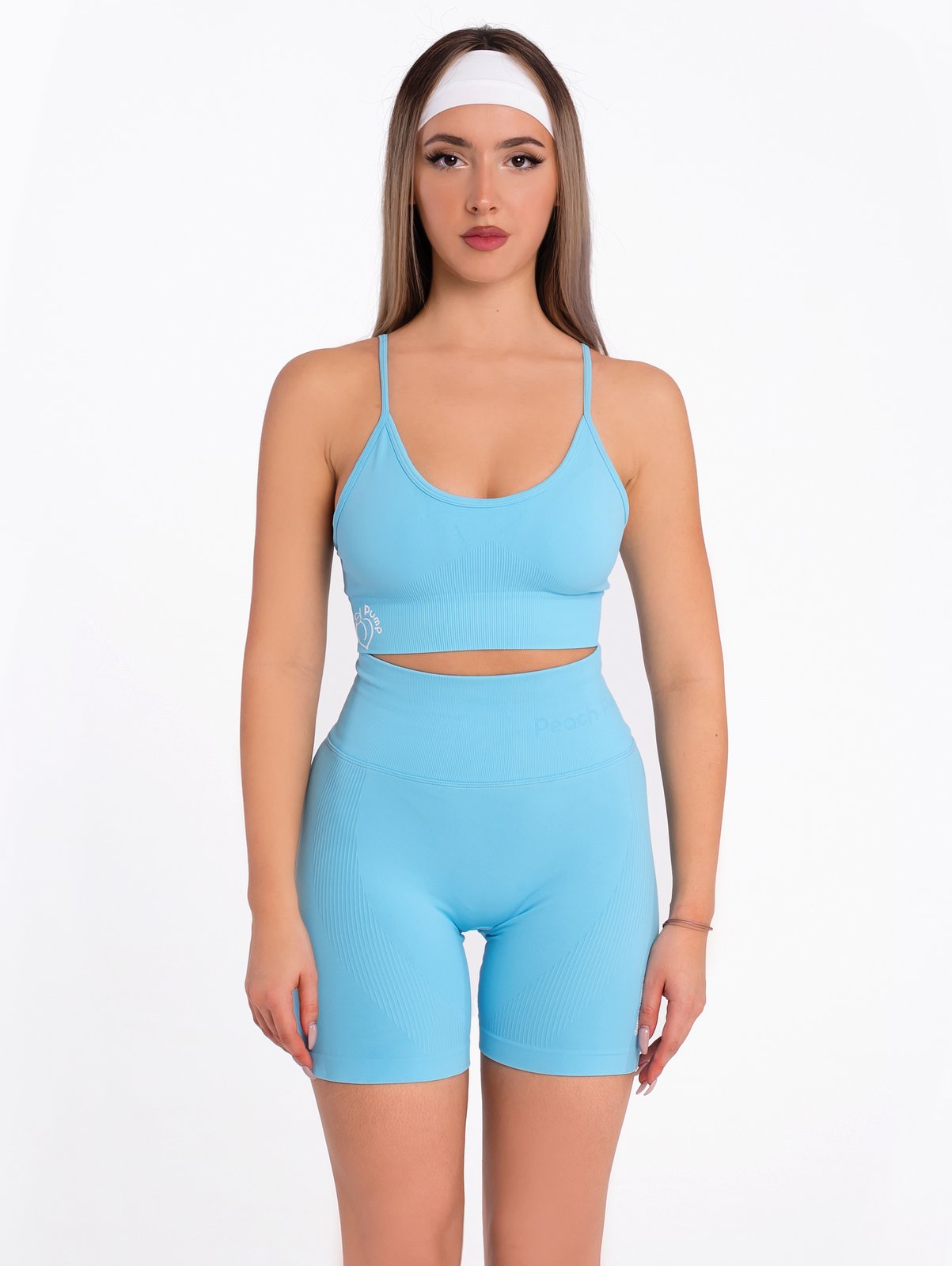 Спортен светло син комплект, къс клин и бюстие, създаден от еластична и мека на допир материя. Състои се от къс клин тип “biker shorts” от безшевна, еластична и мека на допир материя. Този модел оформя перфектно тялото, има широк рипс колан с гравиран надпис “Peach Pump”, който нежно пристяга талията. Плата на клина прикрива проблемните зони, извежда влагата от тялото и има елементи, които оформят дупето тип праскова, за един красив и изящен силует. Бюстието има регулиращи презрамки, подплънки, които по желание се махат, може да се носи и под дрехите, като дизайна му е незабележим, а вие ще чувствате комфорт и свобода на движение. Спортният сет може да се съчетае с аксесоар – шапка и яке от марката, за един перфектен завършек на вашата Peach Pump визия.