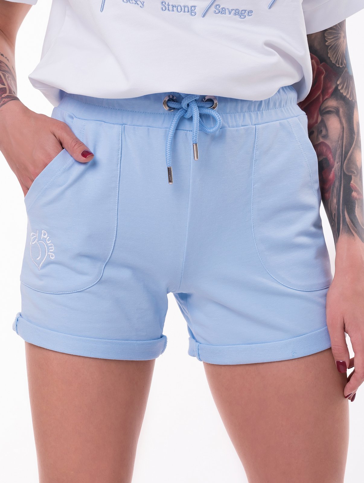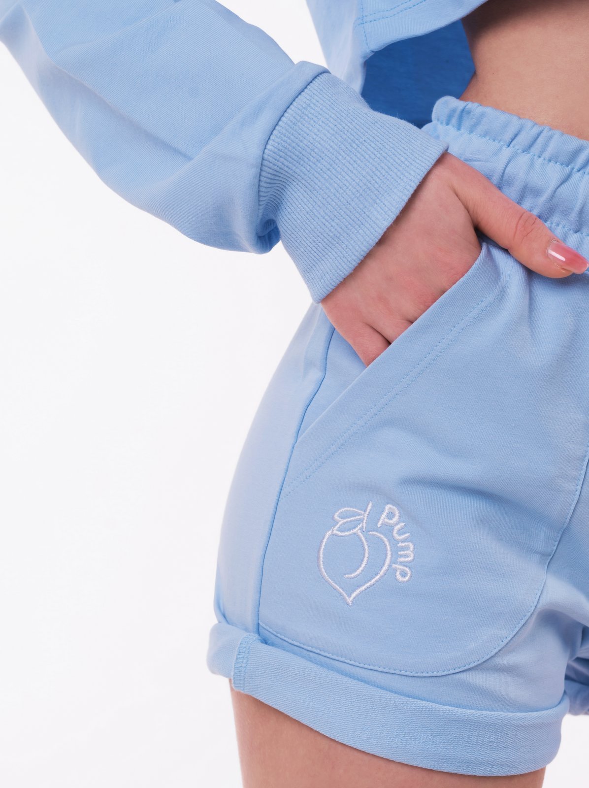 Сини дамски шорти тип спортни къси панталонки. Модела е с джобове в предната част и бродерия Peach Pump на джоба. Панталонките имат връзки , които могат да пристягат талията за по-голям комфорт и удобство по време на тренировка. Този модел се съчетава перфектно с блузката ни Peach Pump с V-образно деколте или къc Crop Top, за един перфектен завършек на визията, подходящ както за фитнес така и за разходка в свободното време.