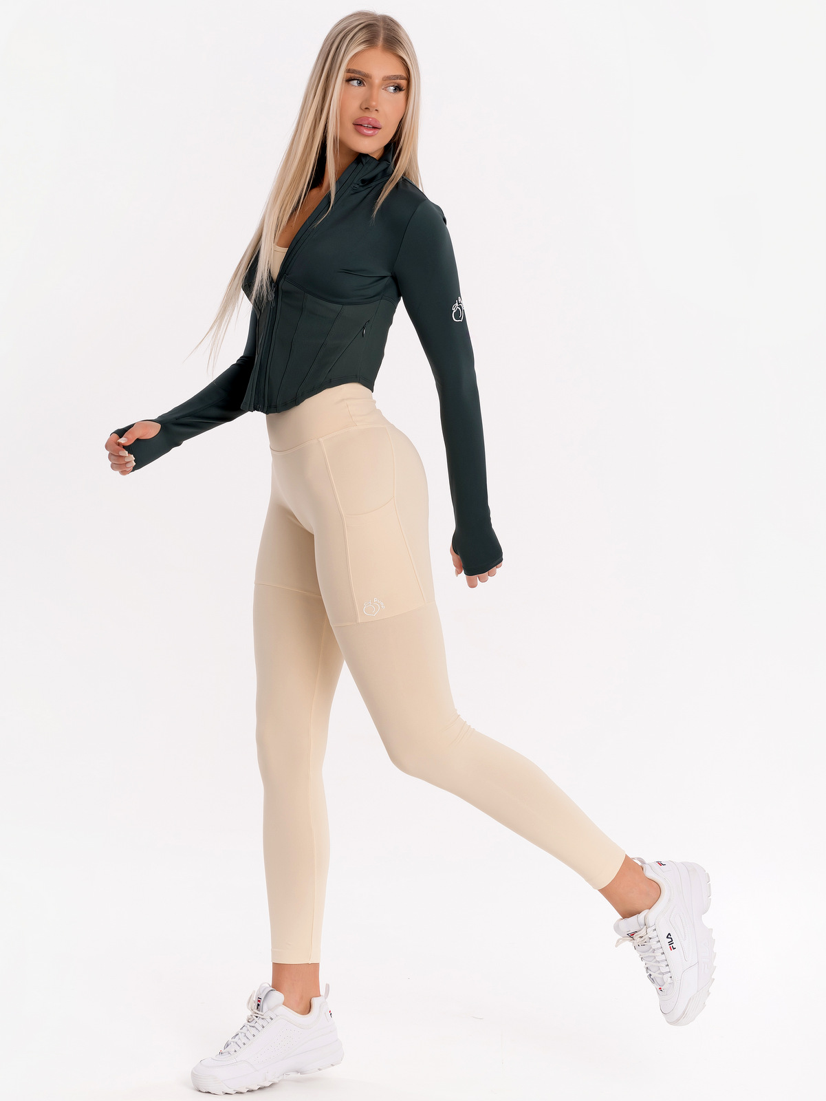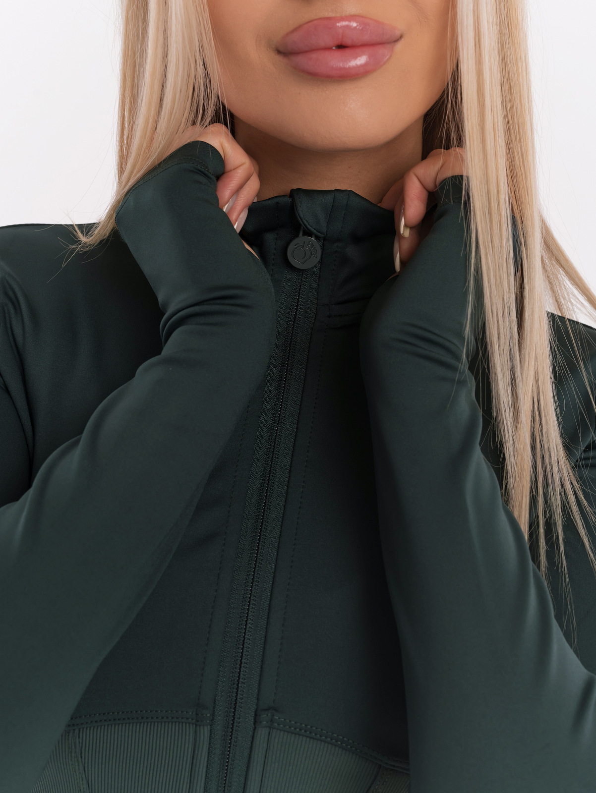 Тъмно зелено спортно яке по тялото, с кройка топ корсет. Този модел прави талията оптически да изглежда по-малка, материята е с високо качество, мека и еластична , стои перфектно и придава красиви, женствени извивки. Моделът има по-висока яка , закопчава се с преден цип с гравирано лого, ръкавите имат отвори за палците. Долната част на якето е със скрити дълбоки странични джобове, които се затварят със скрит цип. Може да приберете без проблем ключове или телефон. В горната част на рамото има бродирано 3D лого Peach Pump. Подходящо е както за разходка в парка, така и за интензивни тренировки, като материята не позволява задържане на влагата в тялото. Предлага се в пет цвята, актуални за сезона, може да съчетаете с клинове и бюстиета. Разгледайте раздел готовите визии на сайта ни за вдъхновение и направете своят перфектен outfit за разходка или тренировка.