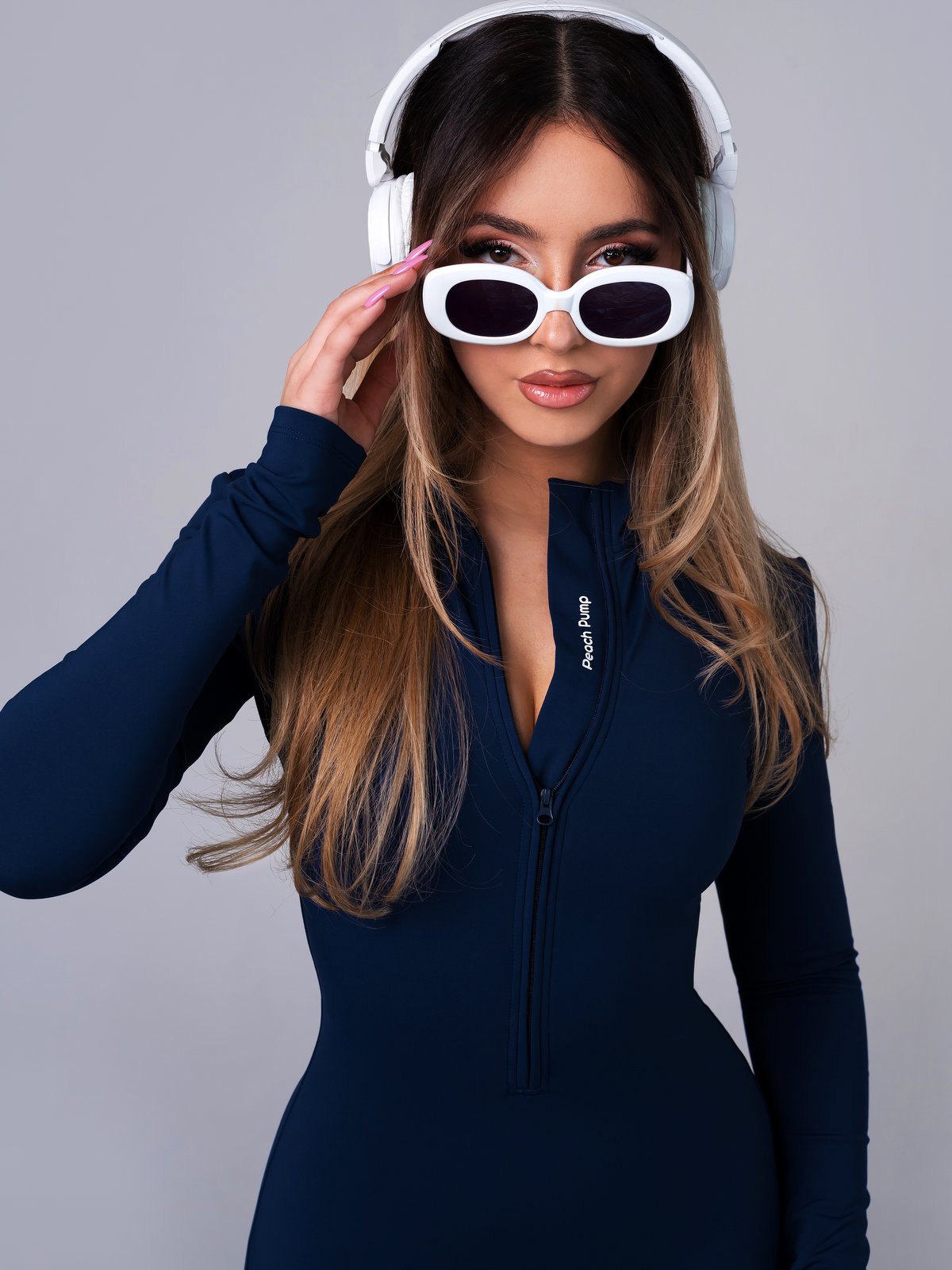 Тъмно син гащеризон по тялото с мека ватирана подплата, дишаща материя, идеална за тренировки или разходки в по-студено време. Модела има цип в предната част, вътрешен надпис Peach Pump и гумирано лого “Peach Pump”на рамото. Гащеризона приляга перфектно по тялото и го извайва тип пясъчен часовник, прикрива несъвършенствата. Моделът няма шев в предната част. Подходящ и за по-високи дами.