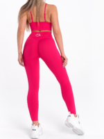 Спортен розово-цикламен комплект, клин и бюстие с дълбоко V деколте . Сета е създаден от безшевна, еластична и мека на допир материя. Този модел оформя перфектно тялото, има по-ниска талия с колан от рипс. Плата на клина прикрива проблемните зони, извежда влагата от тялото и оформят дупето тип праскова, за един красив и изящен силует. Бюстието има секси V деколте, регулиращи презрамки, подплънки с повдигащ ефект, които по желание се махат, може да се носи и под дрехите, като дизайна му е незабележим, а вие ще чувствате комфорт и свобода на движение. Спортният сет може да се съчетае с аксесоар – шапка и яке от марката, за един перфектен завършек на вашата Peach Pump визия.