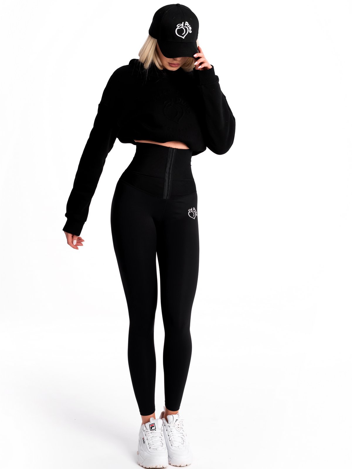 Дамски черен клин с корсет, вграден, разполагащ с тристепенно закопчаване. Клинът е създаден за намаляване обиколката на талията има лек сауна ефект, идеален за жени след раждане, които искат да се върнат бързо в перфектна форма. Подходящ е за силови фитнес и кросфит тренировки или аеробни като бягане и йога. Корсета е твърд, еластичен , клина е от лека бързосъхнеща материя.