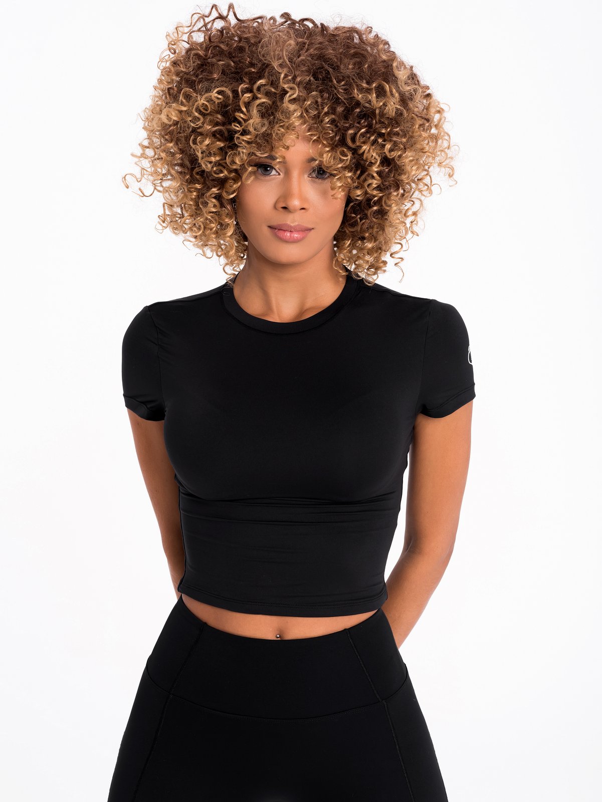 Черна спортна тениска по тялото, с къс ръкав, от изключително мека на допир материя. Стои перфектно, а кройката и я прави незаменима част, както в спортно, така и в ежедневното Ви облекло. Подходяща е за фитнес, бягане, аеробни упражнения или разходка в парка, не задържа влагата в тялото. Тениската има термично запечатано лого “Peach Pump” на рамото, което е минималистично и стои нежно. Ще се влюбите в мекотата на този модел и начина, по който стои на тялото Ви. Съчетава се перфектно с всичките ни модели клинове.