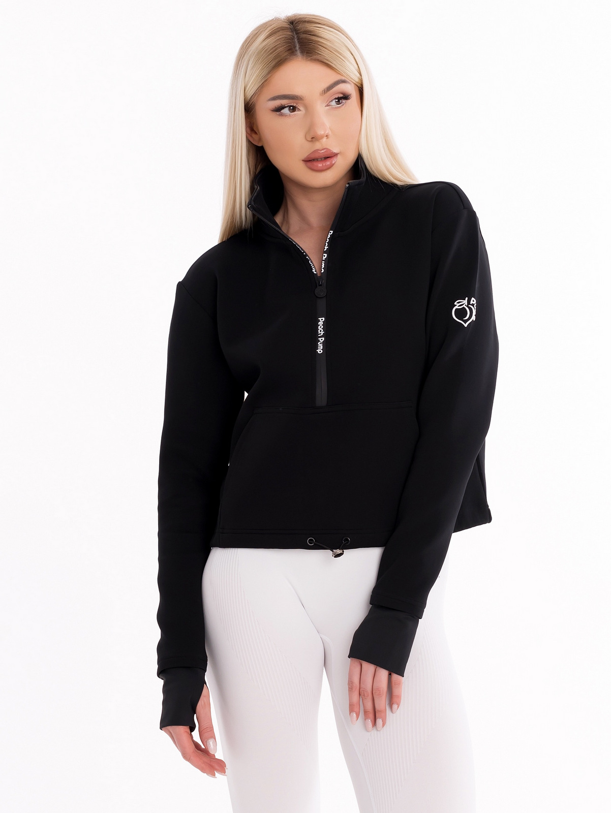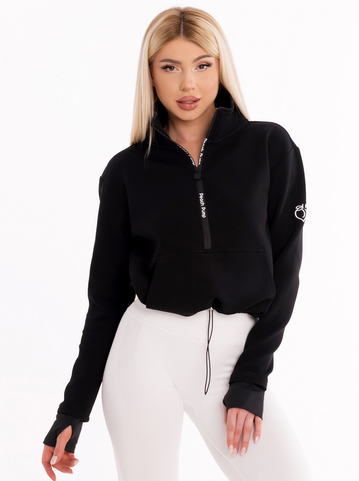 Hanorac negru cu fermoar cu inscripția “Peach Pump” pe lungime. Are guler înalt , mâneci cu găuri pentru degetul mare , un buzunar frontal tip cangur și logo-ul “Peach Pump” imprimat 3D pe umăr. Croiala este lejeră , are o talie elastică. Hanoracul este fabricat din țesătură respirabilă , care nu reține umezeala în corp , potrivit pentru alergare , antrenament de forță și aerobică pentru o plimbare sau parc . Poate fi asortat cu colanți și o căciulă beanie pentru o notă finală perfectă pentru ținuta dvs. Peach Pump.