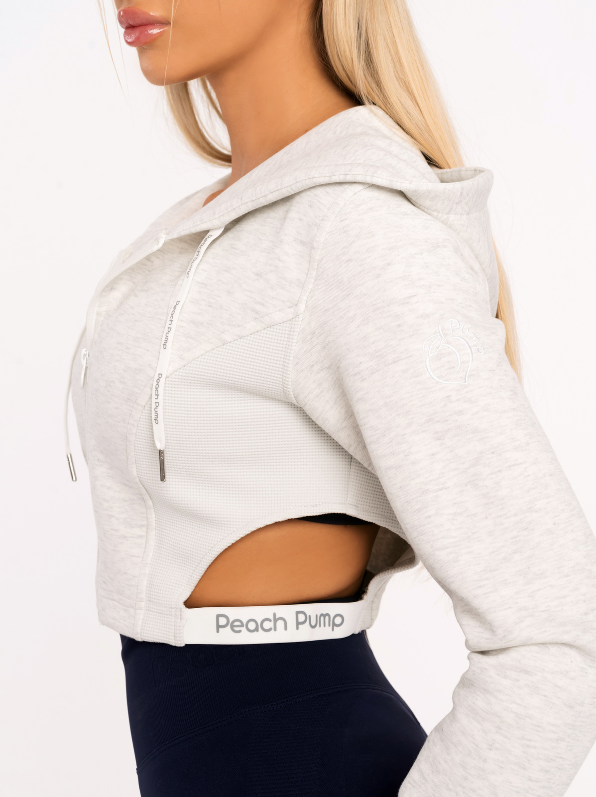 Hanorac scurt gri cu fermoar și glugă. Acest model are un cropped fit, subliniază talia , are detalii decupate și oferă un aspect foarte feminin și elegant. Hanoracul are un detaliu interesant – țesătură din plasă pe părțile laterale, care dă un aspect sportiv și permite pielii să respire. Are un fermoar frontal cu un logo gravat , o glugă largă și legături cu inscripția “Peach Pump” pe lungime și margini metalice. Culoarea gri deschis este moale, proaspătă și versatilă – ușor de combinat cu haine închise la culoare sau deschise.