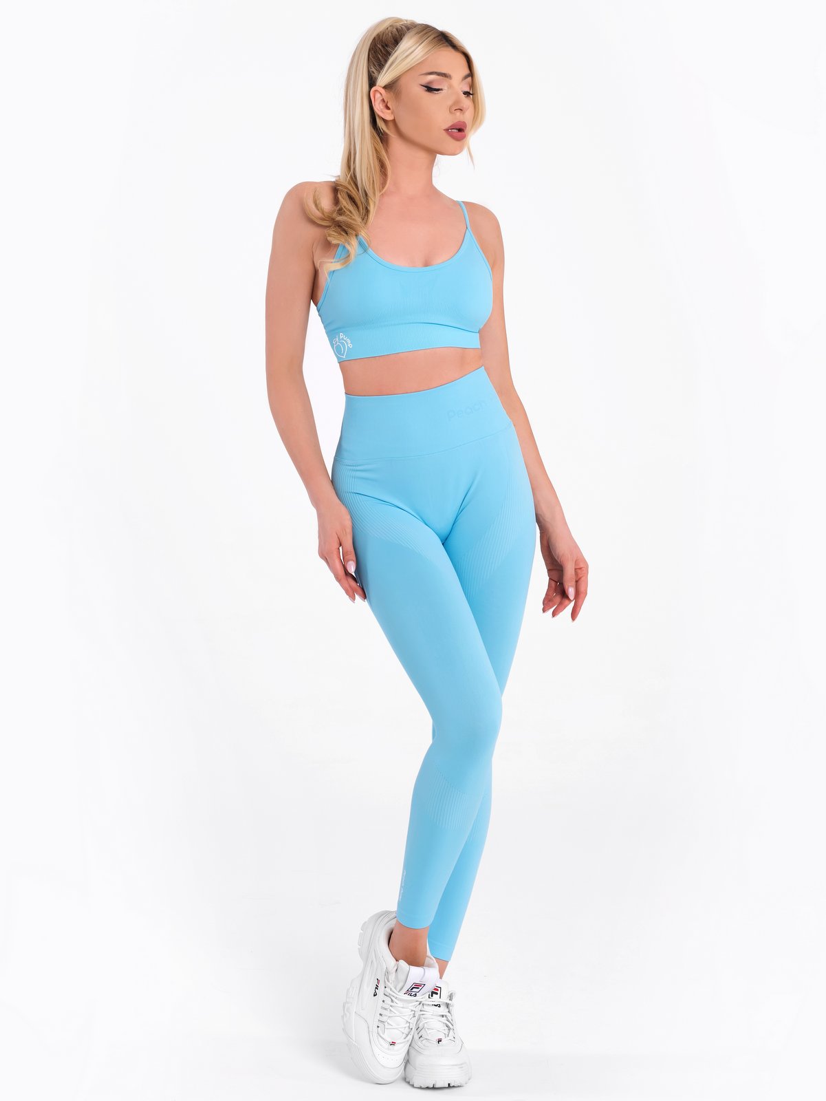 Set albastru deschis, colanți și bustieră, creat din țesătură fără cusături, elastică și moale la atingere. Acest model modelează perfect corpul, colanții au o centură rips lată, cu inscripția “Peach Pump”, care strânge ușor talia. Materialul colanților ascunde zonele cu probleme, îndepărtează umezeala de corp și are elemente care modelează fundul ca o piersică pentru o siluetă frumoasă și grațioasă. Bustiera are bretele reglabile, căptușeală care poate fi îndepărtată la discreție, poate fi purtată sub haine, designul său este discret, iar tu vei simți confort și libertate de mișcare. Setul sportiv poate fi asortat cu șapca și jacheta de accesorii ale brandului, pentru o notă finală perfectă pentru look-ul tău Peach Pump.