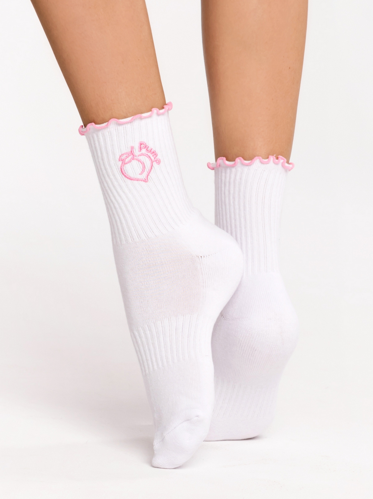 Șosete sport albe cu margine brodată cu volane roz și broderie Peach Pump roz. Au talpă întărită și oferă durabilitate, stabilitate și amortizare atunci când vă mișcați. Potrivite pentru orice sport yoga, pilates, sală de gimnastică , alergare sau o plimbare în parc. Șosetele sunt din bumbac și moi, evacuează umezeala. O notă finală excelentă pentru look-ul tău sportiv.