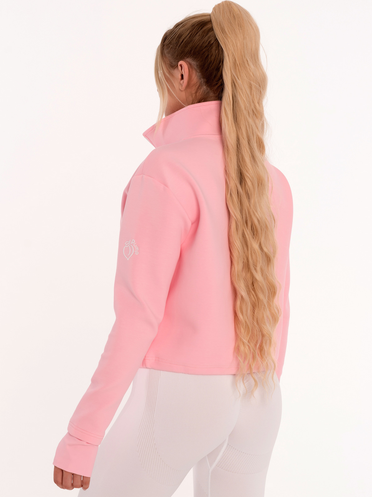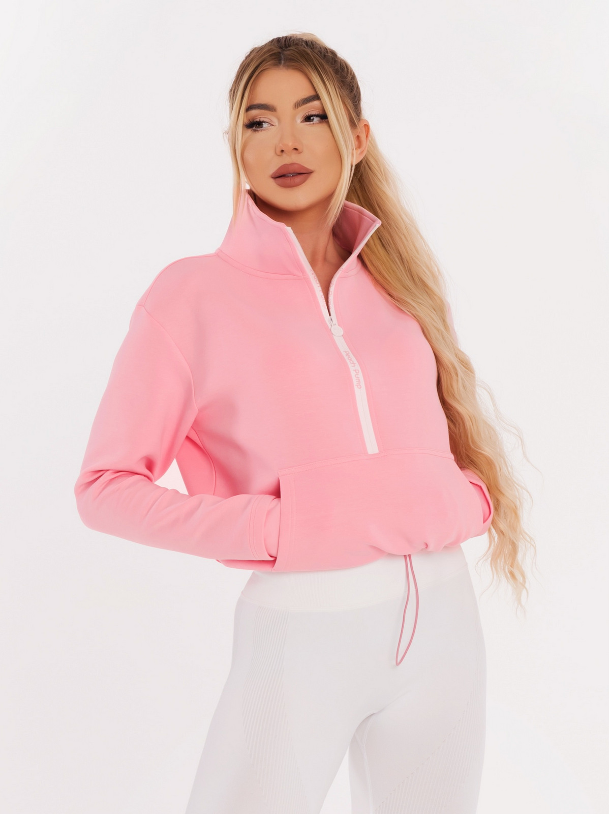 Ružová mikina na zips s nápisom “Peach Pump” po celej dĺžke. Má vysoký golier, rukávy s otvormi na palce, klokanie predné vrecko a vyšité 3D logo “Peach Pump” na ramene. Strih je voľný, má elastický pás. Mikina je vyrobená z priedušnej tkaniny, ktorá nezadržiava vlhkosť v tele, je vhodná na beh, silový a anaeróbny tréning na prechádzku alebo do parku. Dá sa skombinovať s legínami a čiapkou, čím dokonale dotvoríte svoj outfit Peach Pump.