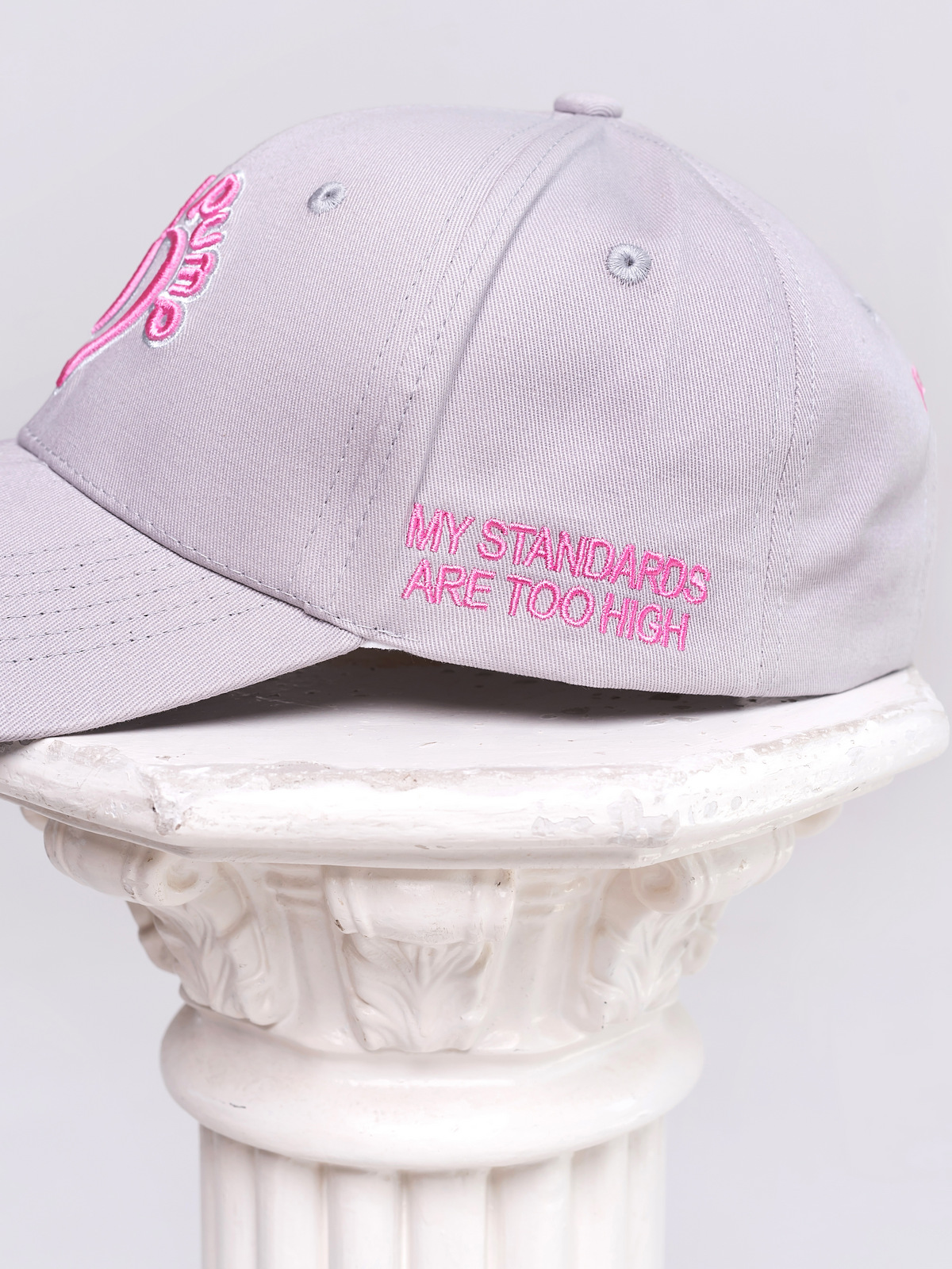 Skombinujte svoje obľúbené legíny a podprsenku so sivou šiltovkou Peach Pump. V horúcich letných mesiacoch bude dokonalým doplnkom vášho vzhľadu a zároveň ochráni vašu tvár pred ostrým slnkom. Šiltovka má výrazný vyšívaný trojrozmerný dizajn s ružovým logom so sivým lemovaním a motivačným sloganom : “Moje štandardy sú príliš vysoké”. Šiltovka má jednu veľkosť, nastavuje sa pomocou kovového zapínania a šilt je zakrivený. Buďte štýlová a odlišná s týmto dokonalým doplnkom vášho športového oblečenia.